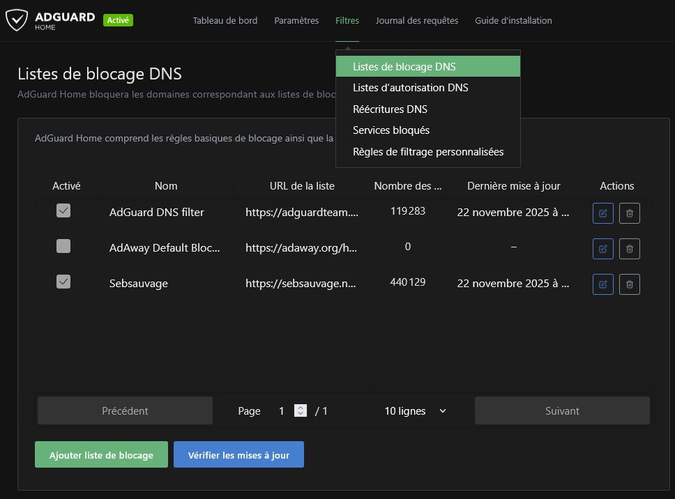 Filtres -> Listes de blocage DNS -> Ajout liste de blocage -> https://sebsauvage.net/hosts/hosts