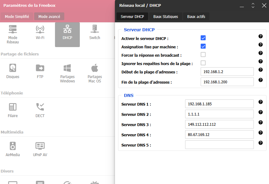 Paramètres -> DHCP -> Serveur DNS 1 -> 192.168.1.185:8080